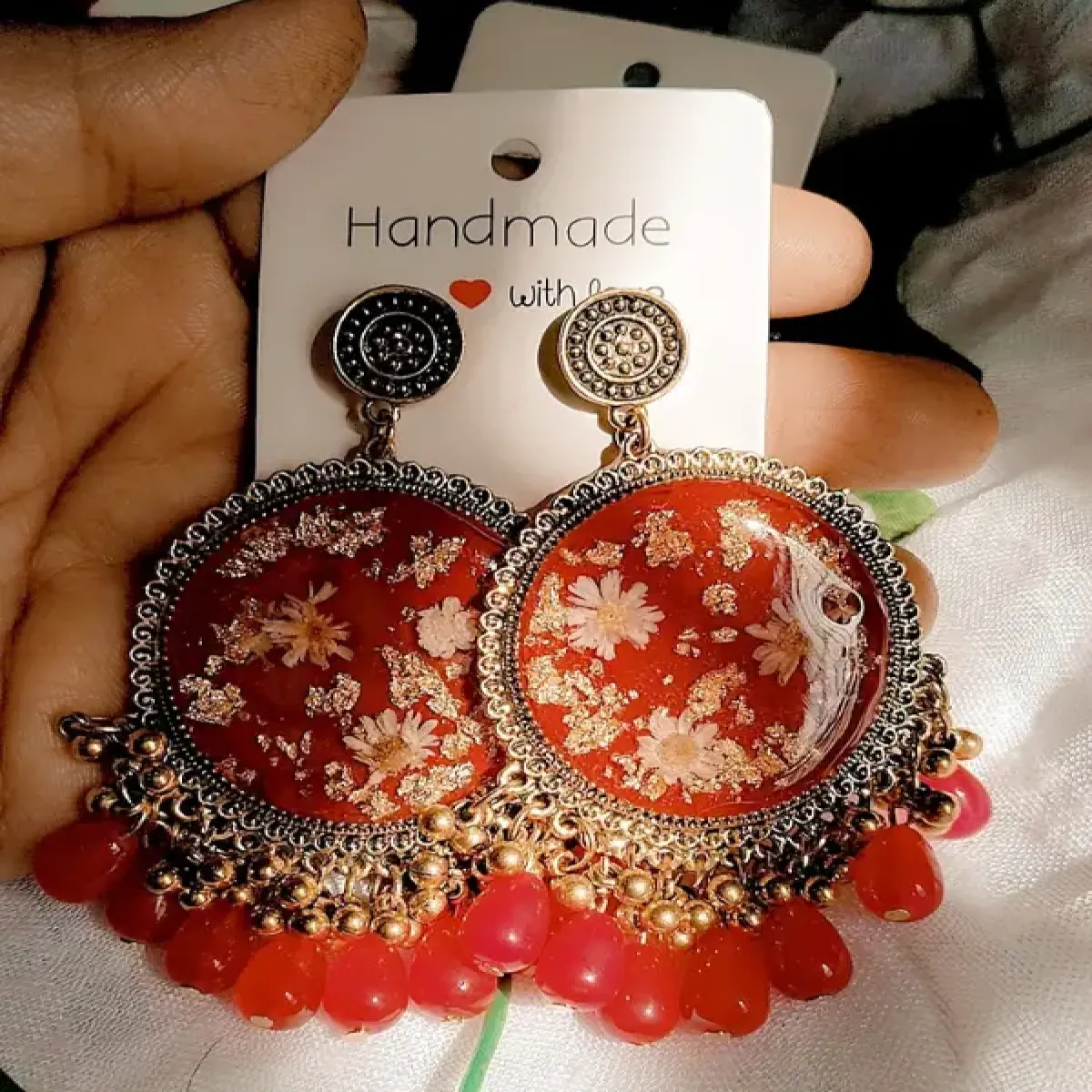 Add a touch of elegance and tradition to your look with these handmade floral resin earrings. Featuring real dried flowers embedded in a rich red resin base, these earrings are framed with intricate antique-gold detailing and finished with dangling red beads and gold-toned balls for a festive flair. Perfect for casual to traditional wear, these statement earrings blend craftsmanship and style beautifully